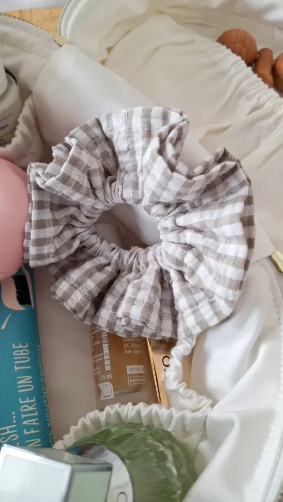 Le principe est simple : un bout de tissu vichy, un élastique et quelques coutures. Ce tuto couture scrunchie est pensé pour tous les niveaux, même pour les débutantes, et permet de se familiariser avec des techniques de base comme la couture droite et l’insertion d’un élastique. Le rendu est joli, léger et légèrement volumineux, parfait pour ajouter du pep’s à une queue de cheval, un chignon ou même pour décorer ton poignet comme un petit bracelet textile.