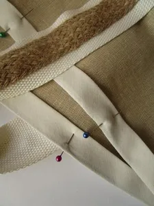 J’ai utilisé un tissu en coton beige pour ce modèle : l’astuce ultime pour un résultat abouti est de choisir des sangles et un biais parfaitement assortis au tissu.