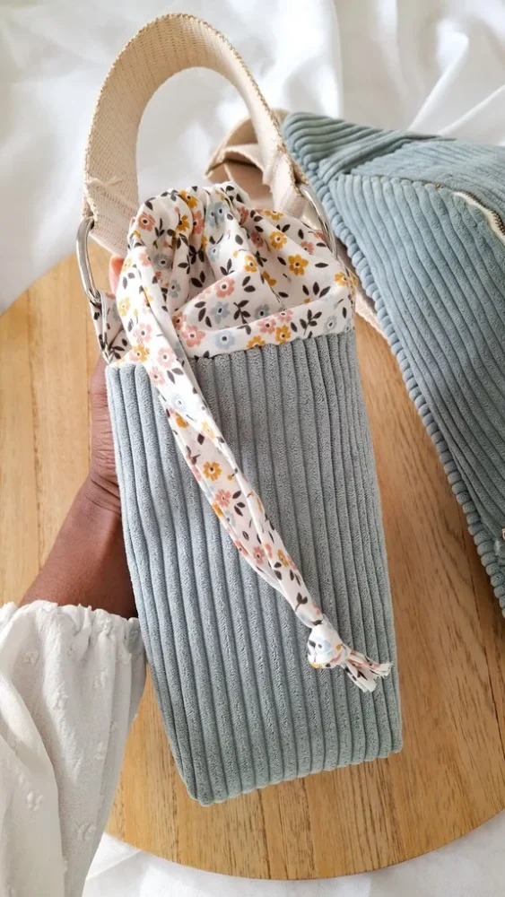Tu peux assortir ton porte-gourde bandoulière à ton sac préféré, ton style du moment, ou même en coudre plusieurs selon tes humeurs. Imagine ton café chaud dans une housse en velours, ton matcha glacé dans un tissu tropical ou ta gourde d’eau fraîche dans une version pastel pour l’été … le rêeeeeeeve !