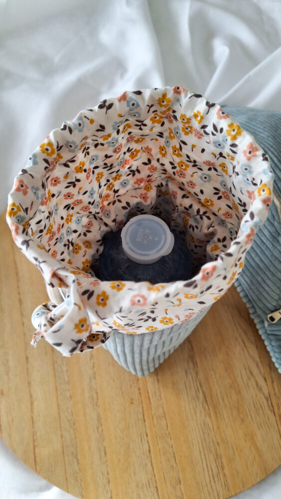 Ce que j’adore avec cette cousette, c’est à quel point tu peux la personnaliser. Coton fleuri, lin naturel, toile cirée ou même tissu matelassé : tout fonctionne parfaitement, pourvu que le tissu se tienne correctement. En effet, le but du jeu est tout de même de supporter le poids de ta gourde, alors n’hésites pas à thermocoller ton tissu s’il te parait un chouïa fin, voire de le matelasser avec une ouate fine.